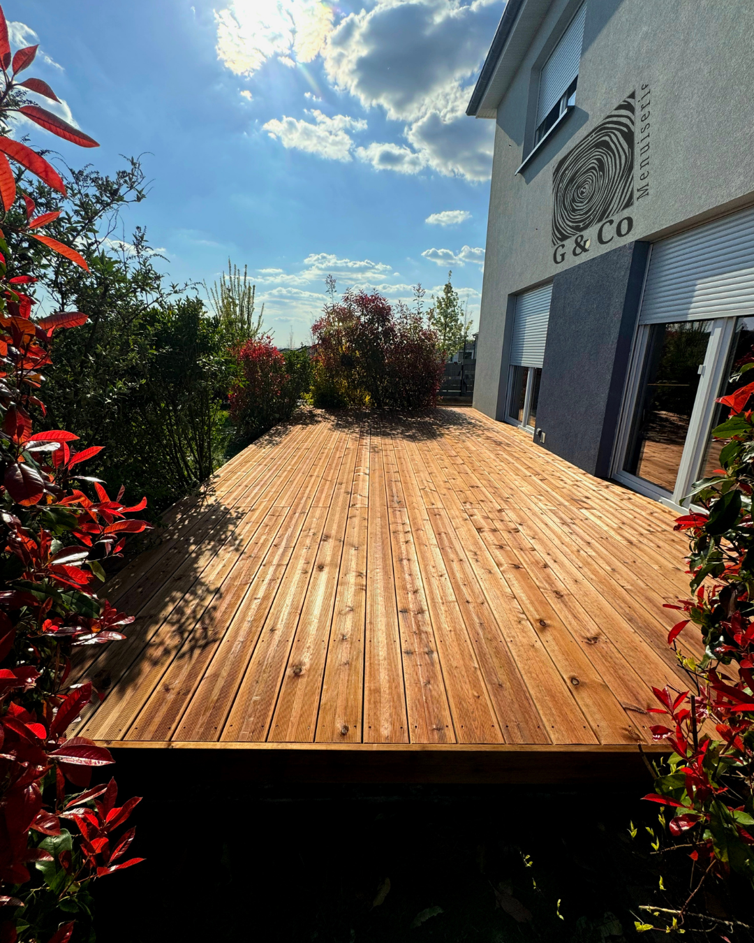 G&Co Menuiserie, votre menuisier local, a conçu et réalisé ce projet en 1 journée, en pin brun strié avec double lambourdage croisé et plots réglables. Résultat : stabilité irréprochable, rendu soigné, budget maîtrisé.